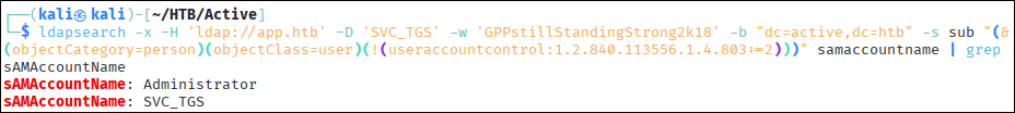 #활성화된 관리자 계정 식별ldapsearch -x -H 'ldap://app.htb' -D 'SVC_TGS' -w 'GPPstillStandingStrong2k18' -b "dc=active,dc=htb" -s sub "(&(objectCategory=person)(objectClass=user)(!(useraccountcontrol:1.2.840.113556.1.4.803:=2)))" samaccountname | grep sAMAccountName